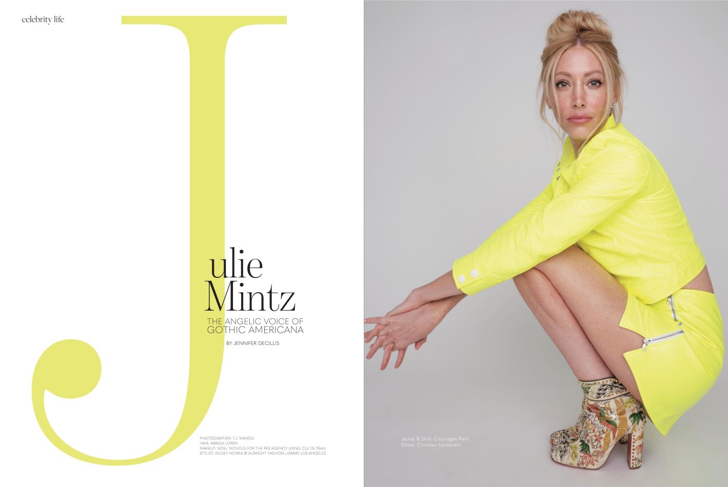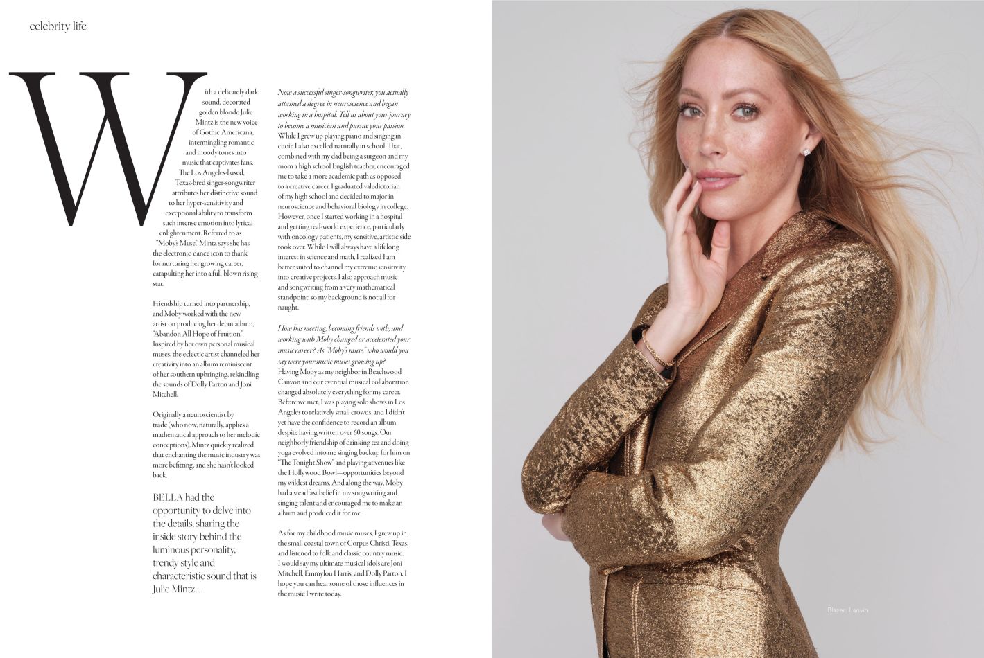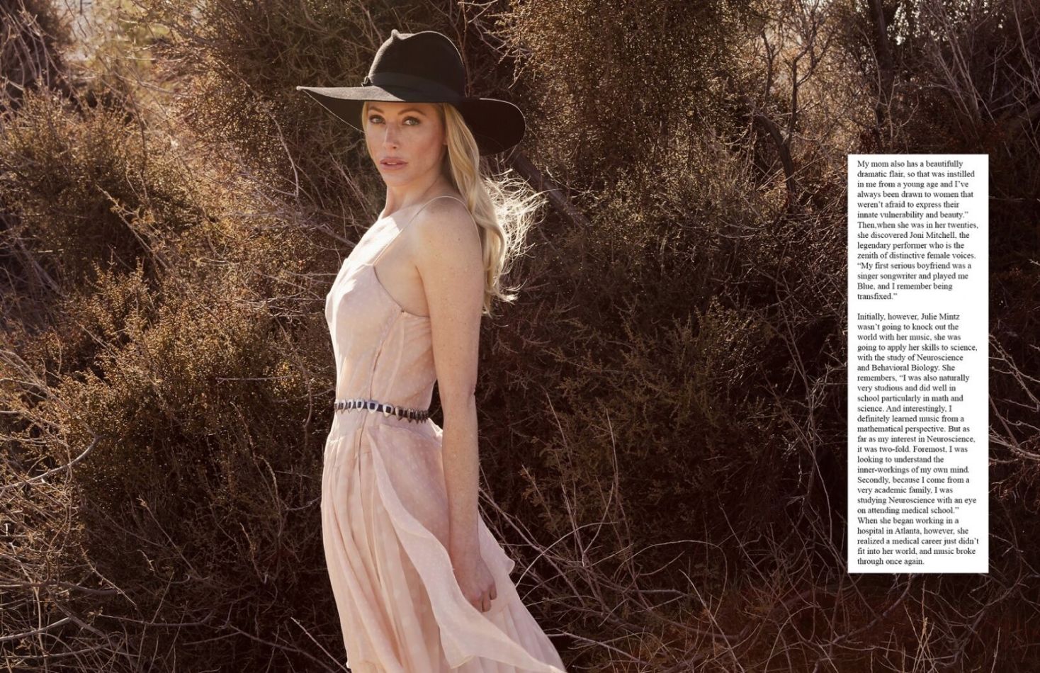Julie Mintz is an American alternative singer-songwriter, musician, and actress. The south Texas-bred, Los Angeles-based singer-songwriter joined Moby's band as a backup singer and keyboardist in 2011. In 2015, Moby produced her debut EP "The Thin Veil" culled from a collection of over fifty songs Mintz had written before joining his band. The sound has been described as Gothic Americana, while Entertainment Weekly calls Mintz's music "an elegant and bewitching blend of Americana and orchestral pop that sits somewhere between Gillian Welch and Lana Del Rey. Julie Mintz was born and raised in Corpus Christi, Texas. She graduated valedictorian of her class and earned a National Merit Scholarship. Her songwriting is deeply informed by her first after-school job: working at a cemetery and funeral home on the Gulf of Mexico, which included driving a hearse with a body in the back. Mintz recalls, "I was a cheerleader in high school, so I used to show up to work at the funeral home in my cheerleading uniform. At the time it was all really scary to me, but I think it ties into me eventually writing this very Gothic music, and this thread throughout my songs about the idea of dying alone"; Mintz holds a Bachelor of Science degree in Neuroscience and Behavioral Biology from Emory University in Atlanta, Georgia. On a summer break from college, Mintz booked her first professional acting role in the Tobe Hooper horror film, Crocodile. She went on to earn her degree in three years and graduated early from college in order to move to Los Angeles full time. Mintz has sung and appeared in over 30 national advertisements for brands such as Gap, Heineken, Mercedes, AT&T, Target, American Airlines, Coors Light, Sprint and an advertisement directed by Academy Award winning cinematographer Wally Pfister. While she has written songs on piano since childhood, it was during her time working as an actress that she bought herself a Gibson J-300 and began composing on guitar. While Mintz honed her songwriting, she acted in films directed by Martin Brest and Spike Lee and opposite Christopher Walker, Rosanna Arquette, and Ryan Gosling. As a recording artist, Mintz has had her music placed in projects by directors J.J. Abrams and Paul Haggis. She has also appeared as a musical guest on The Tonight Show with Jay Leno, Conan, and The Late Show with Stephen Colbert. Mintz's debut five song EP "The Thin Veil" produced by Moby was released jointly on Manimal Records (Warpaint, Bat for Lashes) and her own label Daughters of Cain Records on May 5, 2015. In November 2017, Mintz performed at The Hollywood Bowl with Moby and iconic British DJ Pete Tong. The following year, she released her debut album 'Abandon All Hope of Fruition'; Mintz has volunteered as a Wish Coordinator for the Make-A-Wish Foundation, which serves children with life-threatening illnesses. She has also performed in support of The Humane Society, Mercy For Animals, Emily's List, The Brady Campaign to Prevent Gun Violence, and Al Gore's Climate Reality Project.